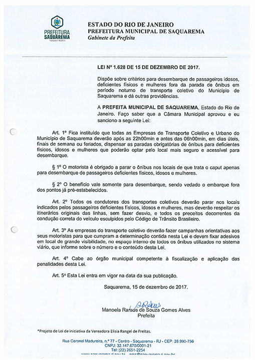 Dispõe sobre critérios para desembarque de passageiros idosos, deficientes físicos e mulheres fora da parada de ônibus em período noturno de transporte coletivo do Município de Saquarema e dá outras providências.
