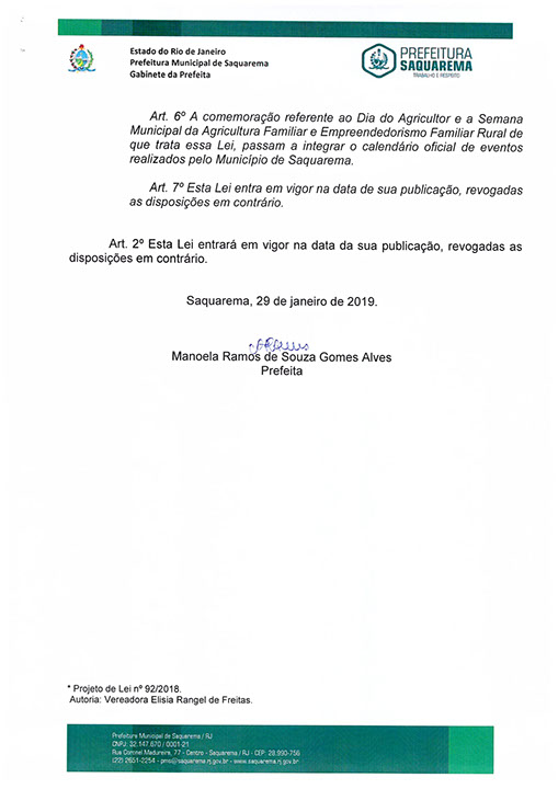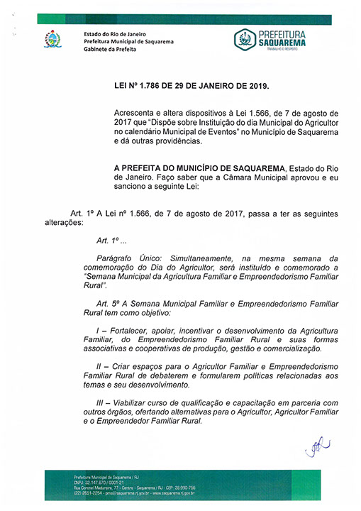 Acrescenta e altera dispositivos á Lei 1.566, de 7 de agosto de 2017 que "Dispõe sobre Instituição do dia Municipal do Agricultor no calendário Municipal de Eventos" no Município de Saquarema e dá outras providências.