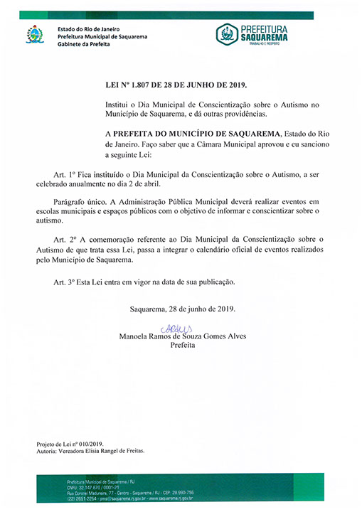 abril, coincidindo com o dia 2 de abril, que é o Dia Municipal da Conscientização sobre o Autismo, no Município de Saquarema.