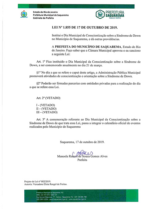 Institui o Dia Municipal de Conscientização sobre a Síndrome de Down no Município de Saquarema, e dá outras providências.