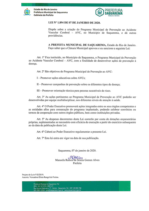 Dispõe sobre a criação do Programa Municipal de Prevenção ao Acidente Vascular Cerebral AVC, no Município de Saquarema, e dá outras providências.