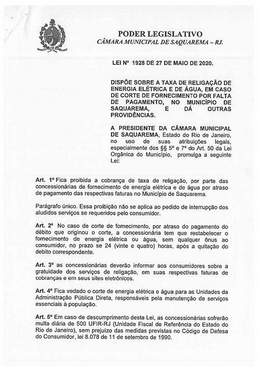 Dispõe sobre a taxa de religação de energia elétrica e de água, em caso de corte de fornecimento por falta de pagamento, no Município de Saquarema, e dá outras providências.