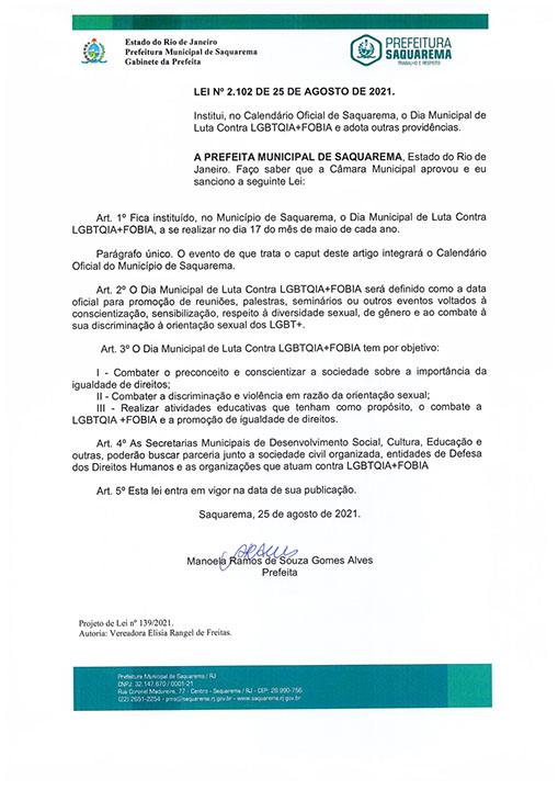 Institui, no Calendário Oficial de Saquarema, o Dia Municipal de Luta Contra LGBTQIA+FOBIA e adota outras providências.