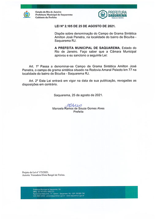 Dispõe sobre denominação do Campo de Grama Sintética Amilton José Penetra, na localidade do bairro de Bicuíba - Saquarema - RJ.