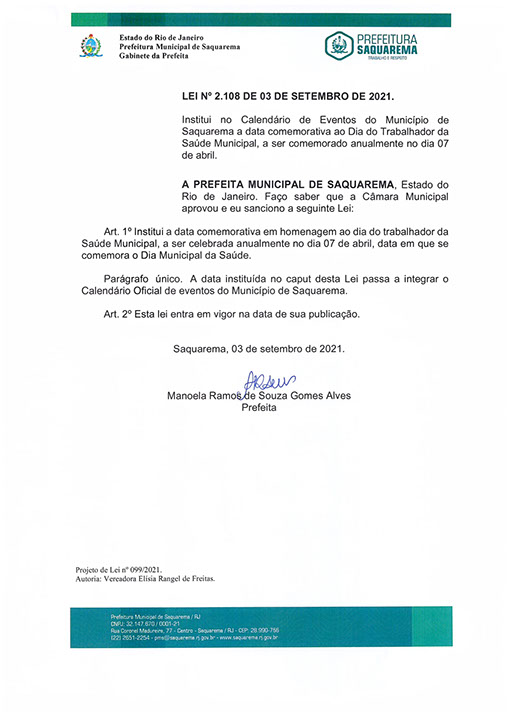 Institui no Calendário de Eventos do Município de Saquarema a data comemorativa ao Dia do Trabalhador da Saúde Municipal, a ser comemorado anualmente no dia 07 de abril.