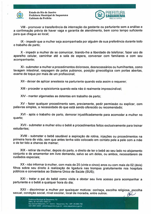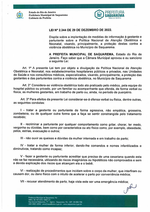 Dispõe sobre a implantação de medidas de informação á gestante e parturiente sobre a Política Nacional de Atenção Obstétrica e Neonatal, visando, principalmente, a proteção destas contra a violência obstétrica no Município de Saquarema.
