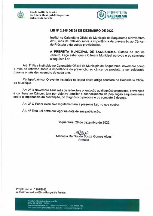 Institui no Calendário Oficial do Município de Saquarema o Novembro Azul, mês de reflexão sobre a importância da prevenção ao Câncer de Próstata e dá outras providências.
