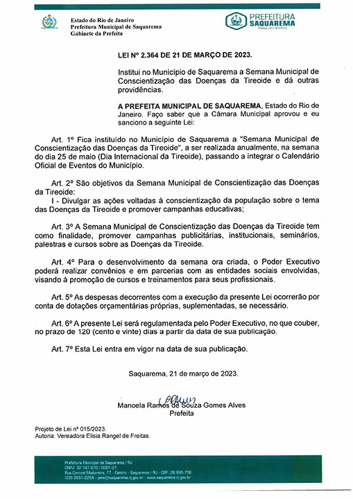 Institui no Município de Saquarema a Semana Municipal de Conscientização das Doenças da Tireoide e dá outras providências.