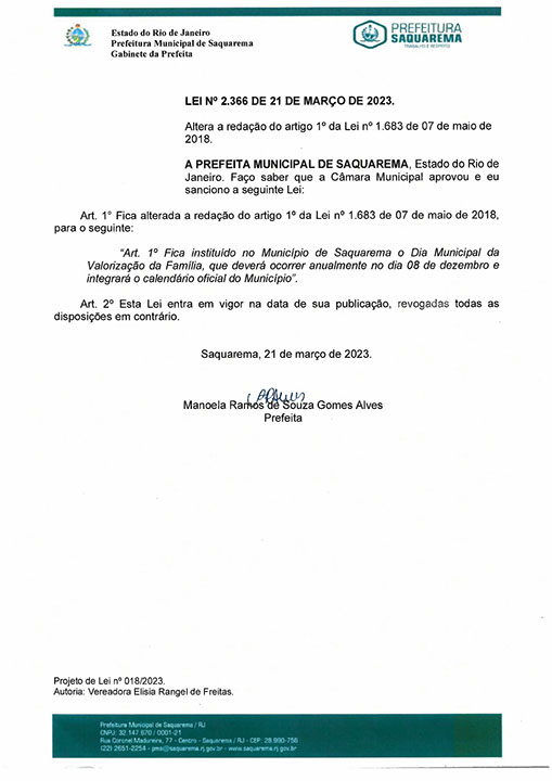 Institui a data 08 de dezembro como o Dia Municipal da Valorização da Família no município de Saquarema.