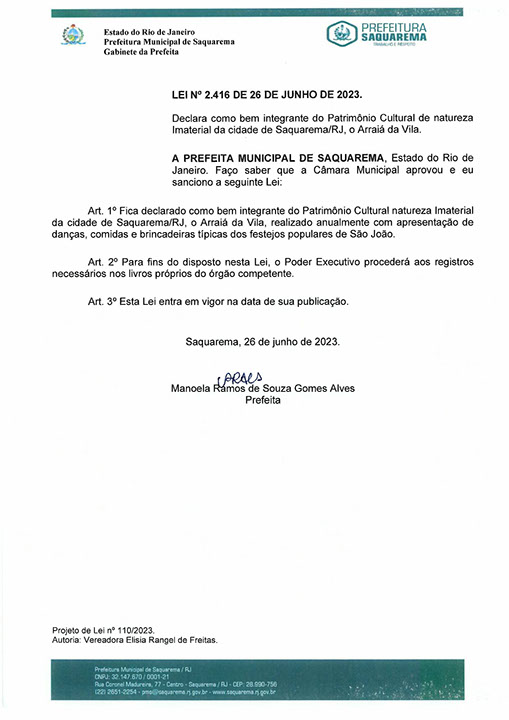 Declara como bem integrante do Patrimônio Cultural de natureza Imaterial da cidade de Saquarema/RJ, o Arraiá da Vila.