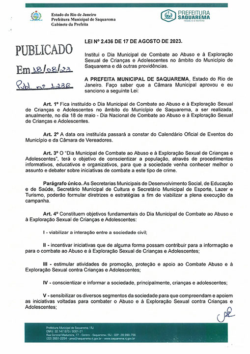 Institui o Dia Municipal de Combate ao Abuso e à Exploração Sexual de Crianças e Adolescentes no âmbito do Município de Saquarema e dá outras providências.