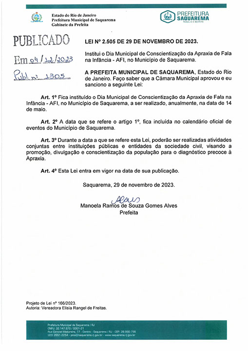 Institui o Dia Municipal de Conscientização da Apraxia de Fala na Infância - AFI, no Município de Saquarema.