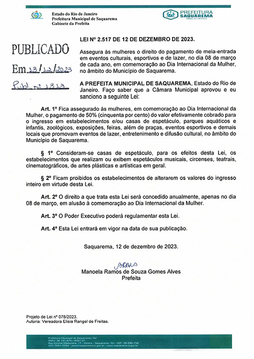 Assegura às mulheres o direito do pagamento de meia-entrada em eventos culturais, esportivos e de lazer, no dia 08 de março de cada ano, em comemoração ao Dia Internacional da Mulher, no âmbito do Município de Saquarema.