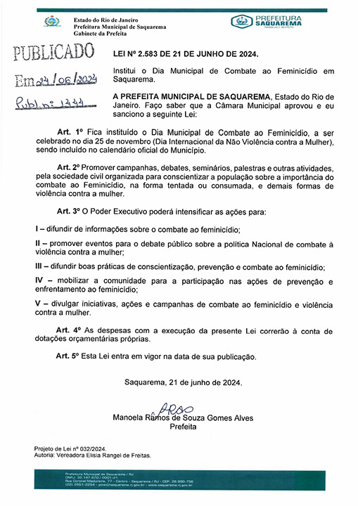 Institui o Dia Municipal de Combate ao Feminicídio a ser celebrado no dia 25 de novembro (Dia Internacional da Não Violência contra a Mulher), em Saquarema.