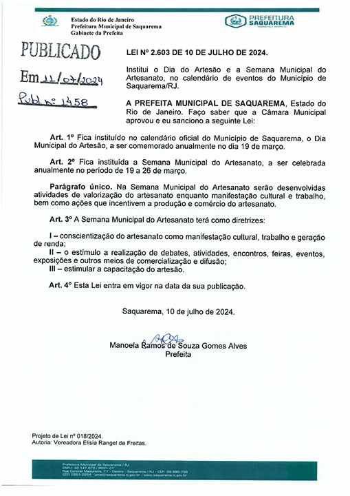 Institui o Dia do Artesão, a ser comemorado anualmente no dia 19 de março e a Semana Municipal do Artesanato, a ser celebrada anualmente no período de 19 a 26 de março, no Município de Saquarema.